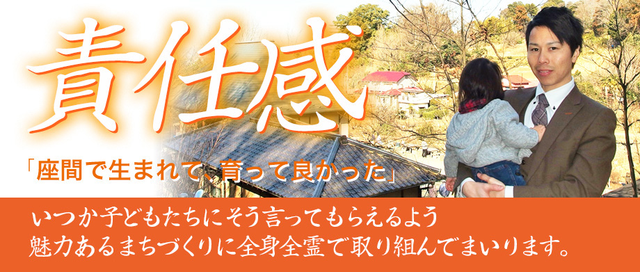 私は仕事の経験上、「地域の声を聞く」、「色々な角度から課題の解決策を探る」ことを大切にしています。これまでに座間市のまちづくりに尽力されてきた 方々をはじめ、大切な家族や自分自身のためにより良いまちづくりを願っている方々と手を取り合い、「情熱」「郷土愛」「責任感」を信条に、皆様一人ひとりの声を市政に反映させ、座間市をさらに魅力あるまちにできるよう地域の課題解決に取り組んでまいります。